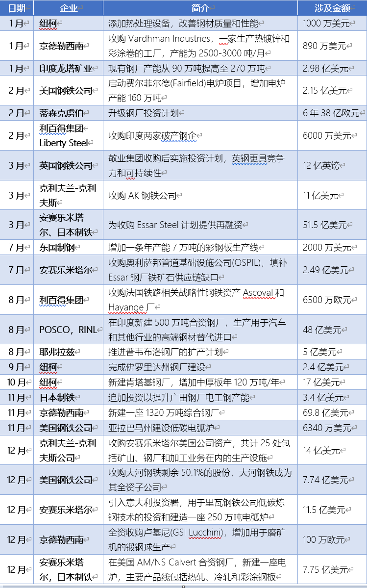 國外鋼鐵企業(yè)2020年并購與資本運(yùn)作一覽表