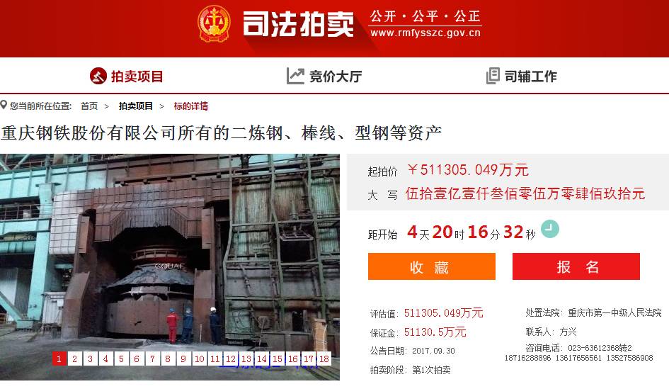 近日,人民法院訴訟資產網掛出重慶鋼鐵股份有限公司(下稱“重鋼”)的3項資產拍賣公告,將在2017年10月16日10:00至10月17日10:00(延時除外)對標的物按現狀依法進行公開整體拍賣,起拍價合計達到百億元的規模。