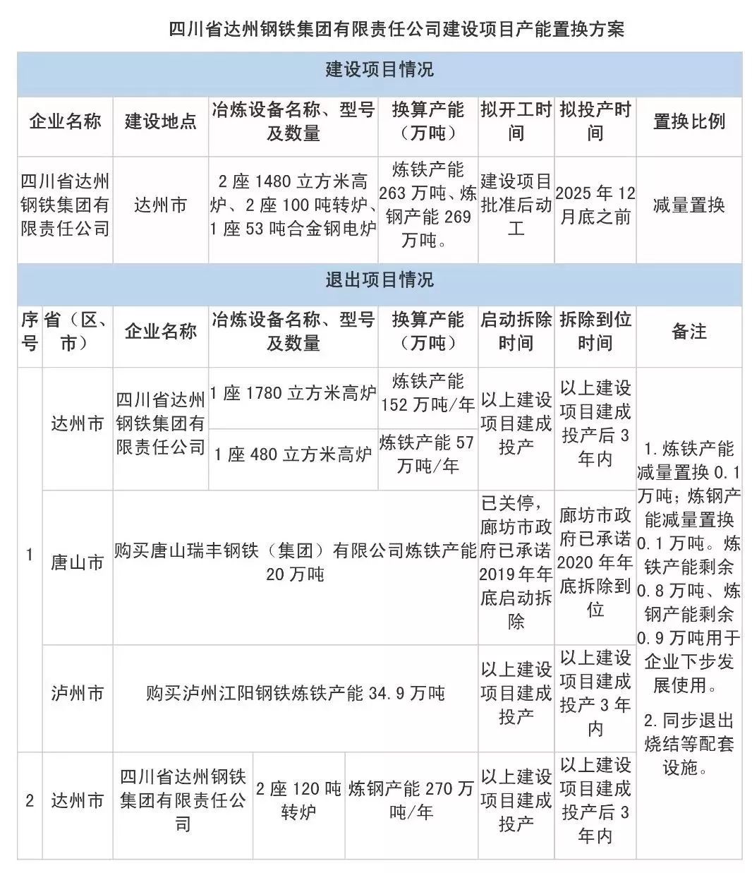 2019年8月5日,達(dá)州市經(jīng)濟(jì)和信息化局公示了四川省達(dá)州鋼鐵集團(tuán)有限責(zé)任公司產(chǎn)能置換方案,擬新建2座1480立高爐、2座100噸轉(zhuǎn)爐和1座53噸合金鋼電爐。