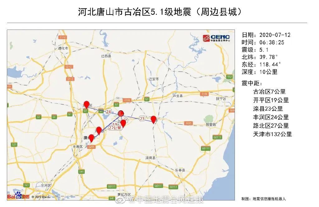 中國地震臺網正式測定:07月12日06時38分在河北唐山市古冶區發生5.1級地震,震源深度10千米。