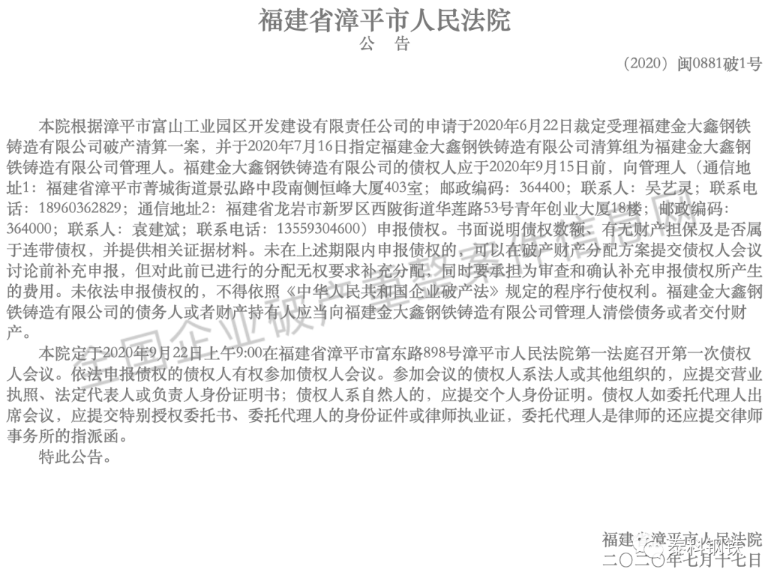 2020年7月17日,福建省漳平市人民法院發布公告:本院根據漳平市富山工業園區開發建設有限責任公司的申請于2020年6月22日裁定受理福建金大鑫鋼鐵鑄造有限公司破產清算一案,并于2020年7月16日指定福建金大鑫鋼鐵鑄造有限公司清算組為福建金大鑫鋼鐵鑄造有限公司管理人。