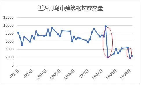 7月17日上午,烏魯木齊市場商戶開始居家辦公,庫房裝貨受限,市場成交大幅縮量。據(jù)烏魯木齊區(qū)域樣本企業(yè)日成交量統(tǒng)計數(shù)據(jù)顯示,6-7月上旬烏魯木齊市場建筑鋼材日均成交量