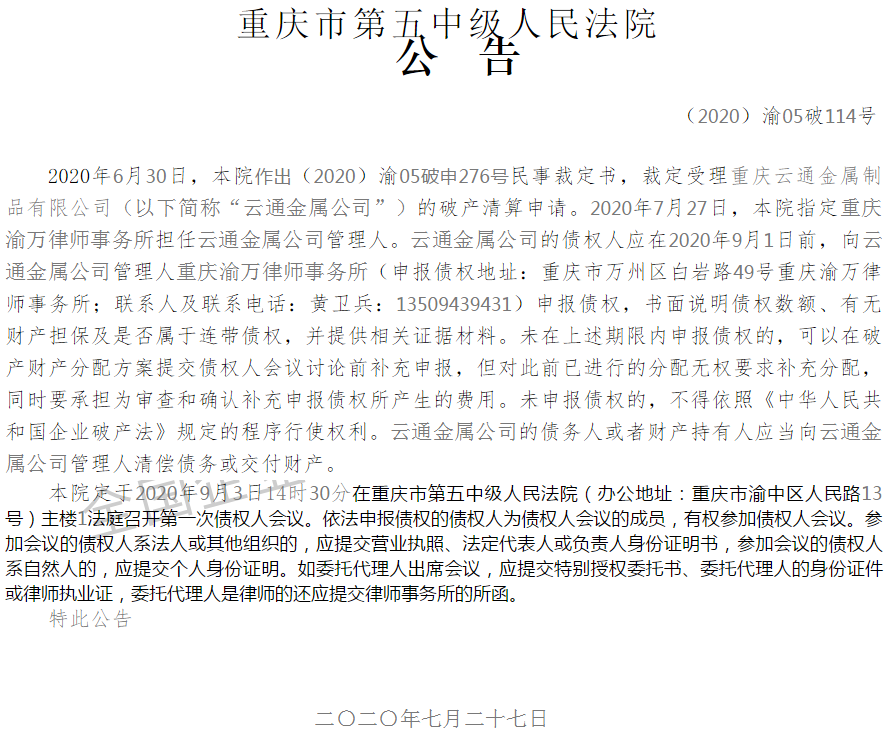 公開資料顯示,重慶云通金屬制品有限公司成立于2008年6月份,是一家集專業設計、制造、銷售及配套服務為一體的民營企業。