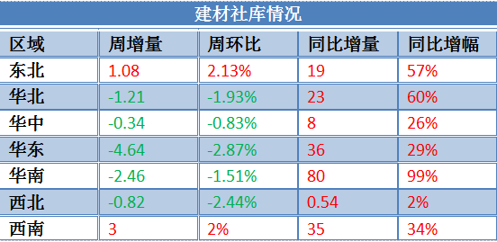 本周建材降庫區(qū)域增多,除東北和西南地區(qū)仍有累庫外,其余五大市場均呈現(xiàn)庫存去化。但目前總庫存依然高出去年同期,尤其華南和華北市場庫存超出去年50%以上。