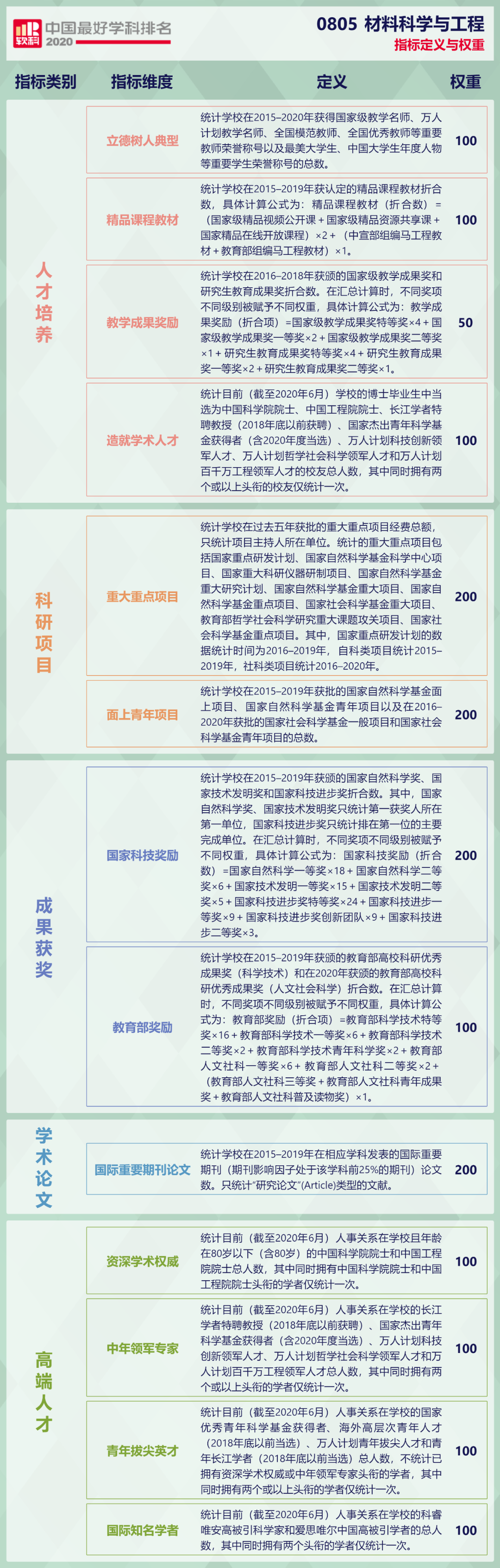 中國最好學科排名的指標體系由人才培養、科研項目、成果獲獎、學術論文、高端人才5個指標類別組成,下設16個指標維度,包括50余項測量指標。由于部分指標在不同學科門類的適用性和重要性存在差別,因此中國最好學科排名在不同學科采用差異化的指標體系。材料科學與工程學科的指標定義與權重如下: