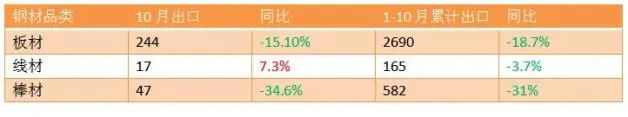 海關(guān)總署最新數(shù)據(jù),10月我國鋼鐵板材出口244萬噸,同比下降15.1%。1-10月累計出口2690萬噸,同比下降18.7%。較上個月降幅收窄,隨著國際和國內(nèi)鋼材價差收窄,出口降幅放緩,但疫情對出口的影響仍在,短期出口下降難有方向上的改變。