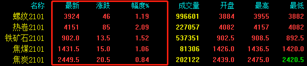 期鋼今日全面收漲,且期卷再創(chuàng)新高,期貨強(qiáng)勢(shì)給現(xiàn)貨價(jià)格帶來(lái)提振。收盤來(lái)看,期螺漲46收?qǐng)?bào)3924,期卷漲85收?qǐng)?bào)4151,鐵礦石漲13.5收?qǐng)?bào)902,焦煤漲15收?qǐng)?bào)1431.5,焦炭漲20.5收?qǐng)?bào)2449.5。