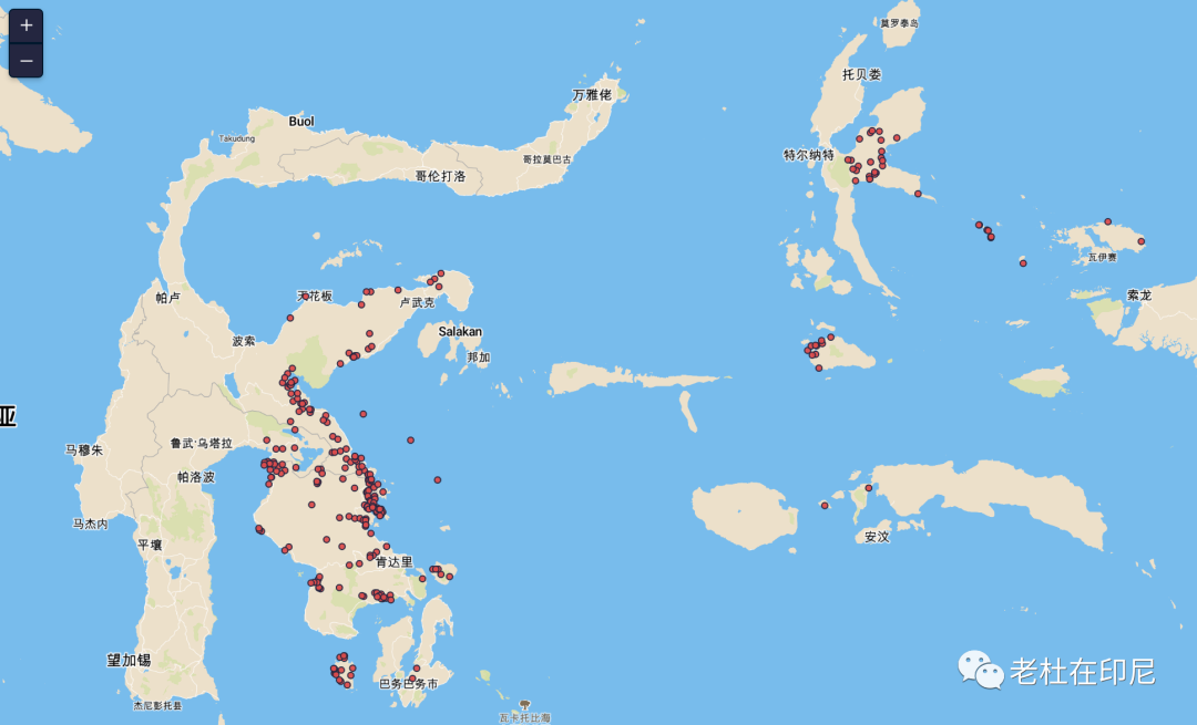 印尼目前29座中外鎳冶煉廠分布圖。其中:蘇拉威西19座,北馬魯古8座,爪哇2座。