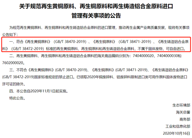 10月,生態(tài)環(huán)境部、海關(guān)總署、商務(wù)部、工信部發(fā)布《關(guān)于規(guī)范再生黃銅原料、再生銅原料和再生鑄造鋁合金原料進(jìn)口管理有關(guān)事項(xiàng)》的公告稱,符合《再生黃銅原料》、《再生銅原料》、《再生鑄造鋁合金原料》標(biāo)準(zhǔn)的再生黃銅原料、再生銅原料、再生鑄造鋁合金原料,不屬于固體廢物,可自由進(jìn)口。