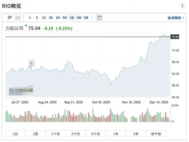 在2020年10月底的時候,力拓的股價只有55美元左右,但目前力拓的股價已經(jīng)上漲到76美元左右,漲幅超過88%。