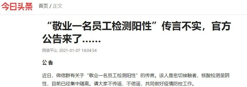 敬業一名員工檢測陽性?謠言!河北最新疫情公告來了……