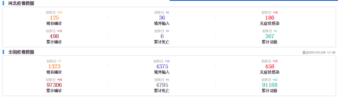 截至1月7日24時,河北省現有本地確診病例123例(重型5例、普通型118例)、境外輸入確診病例2例(普通型)。累計治愈出院病例367例(含境外輸入34例),累計死亡病例6例,累計報告本地確診病例462例、境外輸入病例36例。尚在醫學觀察本地無癥狀感染者181例、境外輸入無癥狀感染者5例。