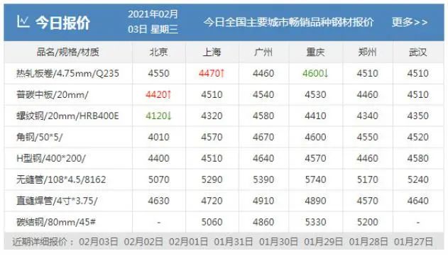2月3日、螺紋鋼24個市場中2個市場下跌20,20mmHRB400E平均價格4321元/噸,較上個交易日下調(diào)2元/噸;