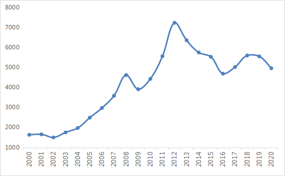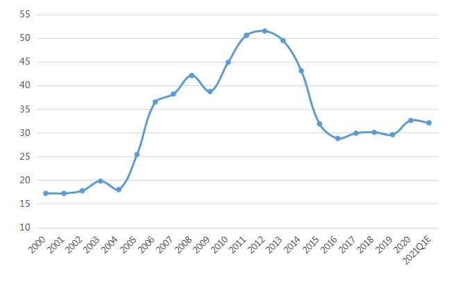 另根據(jù)國際期貨行業(yè)協(xié)會(Futures Industry Association(FIA))統(tǒng)計的2020年全球期貨成交量數(shù)據(jù)顯示,中國的大商所位居全球交易所期貨和期權(quán)成交量排名第7位,其鐵礦石期貨交易則以284,630,172手(折合284.63億噸)位居全球金屬期貨交易的第3位(2019年鐵礦石以29,658,011手(折合296.58億噸)位列次席)。2020年,大商所的鐵礦石相關(guān)期貨(權(quán))成交量和成交額則高達284.63億噸和21.59萬億元,由此計算的2020年大商所鐵礦石期貨價格平均價格為109.9美元/噸。而2020年全年普氏鐵礦石價格指數(shù)的平均值為108.9美元/噸,相差無幾。