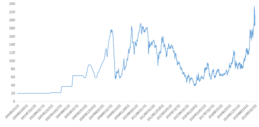 2018年5月至2021年6月期間內(nèi)的普氏鐵礦石價格指數(shù)均值為108.2美元/噸。同期普氏鐵礦石價格指數(shù)的平均價格為105.2美元/噸、區(qū)間內(nèi)普氏鐵礦石價格指數(shù)的標(biāo)準(zhǔn)差41.2美元/噸,即價格在64美元/噸至146美元區(qū)間均屬數(shù)據(jù)的正常分布。