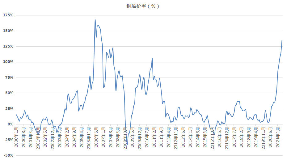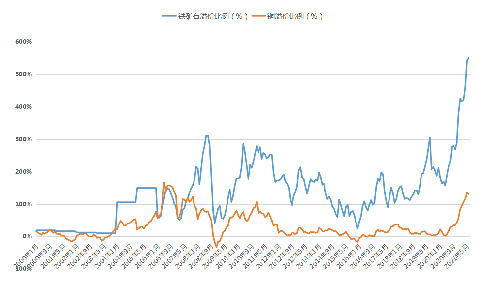 相對于銅市場的整體供需格局以及銅的資源方的國家分布、抗疫能力等特點以及中國鋼鐵工業(yè)在抗疫期間的絕對“優(yōu)秀”表現(xiàn),優(yōu)質(zhì)鐵礦石資源高度集中于澳大利亞的特點被更多的資本所青睞,鐵礦石溢價水平逐漸偏離銅的溢價水平,鐵銅溢價相關(guān)度也由2020年3月的98.4%逐月下降至2020年12月的90.2%(相當(dāng)于2018年4月水平),以后隨著銅價的上升帶動銅成本溢價的提高而逐漸恢復(fù)至95.9%水平。