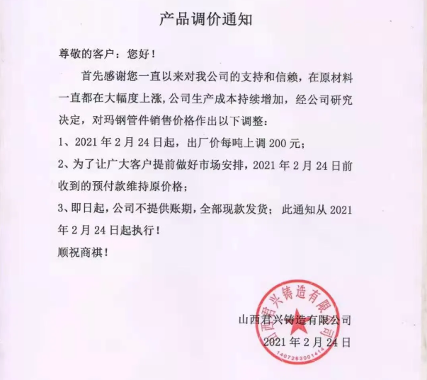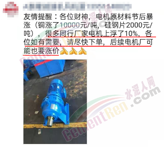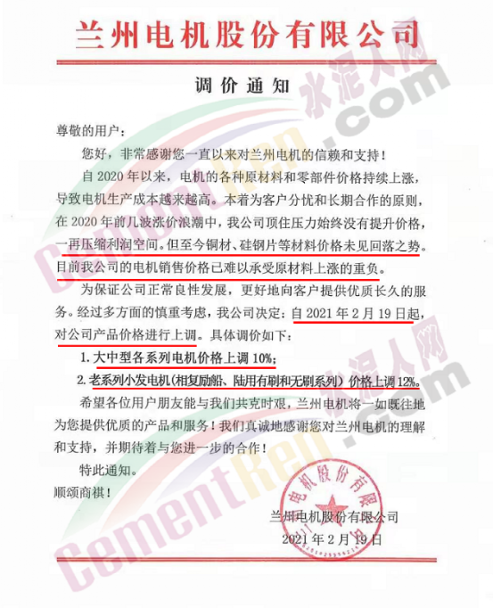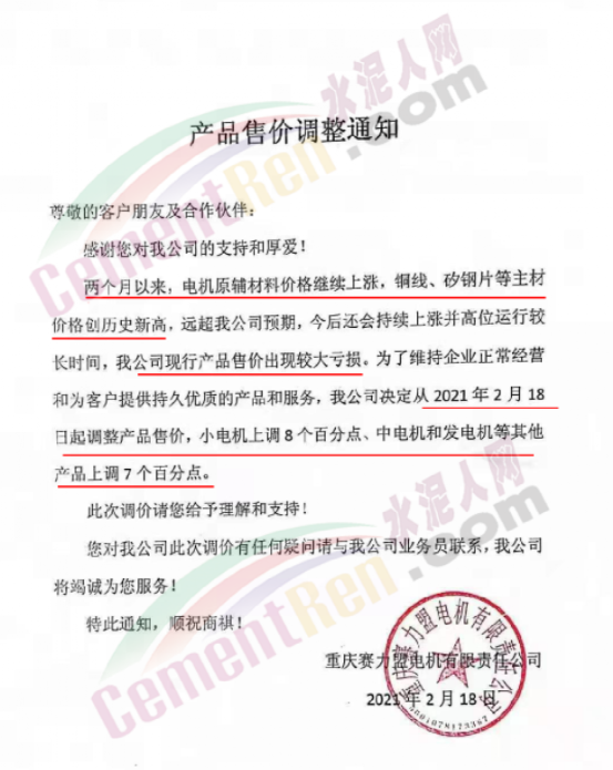 重慶賽力盟電機有限責任公司通知,兩個月以來,電機原輔材料價格繼續上漲,銅線、矽鋼片等主材價格創歷史新高,遠超公司預期,今后還會持續上漲并高位運行較長時間,公司現行產品售價出現較大虧損。為了維持企業正常經營和為客戶提供持久優質的產品和服務,決定從2021年2月18日起調整產品售價,小電機上調8個百分點、中電機和發電機等其他產品上調7個百分點。