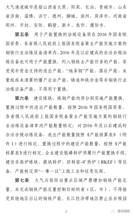 2016年各省級人民政府、國務院國資委向國務院報備的去產能實施方案中,列明了本地區現有鋼鐵企業冶煉設備清單及對應產能(以下簡稱“備案清單”)。備案清單是指導我們開展去產能工作的基礎,在備案清單內的產能、2016年及以后建成的合法合規產能均可用于置換,不在備案清單內的產能,不得用于置換。同時,對于不可用于置換的產能范圍,在原來“1個必須,6個不得”(即用于產能置換的冶煉設備必須在備案清單內,6種不得用于置換的情形)的基礎上,將“未重組或未清算的‘僵尸企業’產能”和“鐵合金產能”納入不能用于置換的產能范圍。