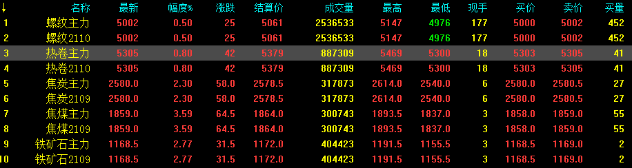 期螺上漲25收?qǐng)?bào)5002,期卷上漲42收?qǐng)?bào)5305,鐵礦石上漲31.5收?qǐng)?bào)1168.5,焦煤上漲64.5收?qǐng)?bào)1859,焦炭上漲58收?qǐng)?bào)2580。