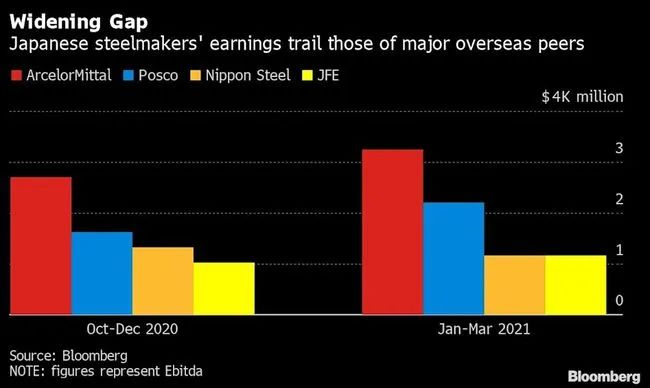 隨著各國經濟從疫情中復蘇的步伐加快,以及天量刺激措施釋放了需求,全球鋼鐵企業眼下正獲益。不過,盡管新日鐵及其國內同行日本鋼鐵工程控股公司(JFEHoldingsInc)自去年下半年以來利潤大幅回升,但仍落后于歐洲鋼鐵巨頭安賽樂米塔爾(ArcelorMittal SA)和韓國浦項制鐵(Posco)等主要競爭對手。