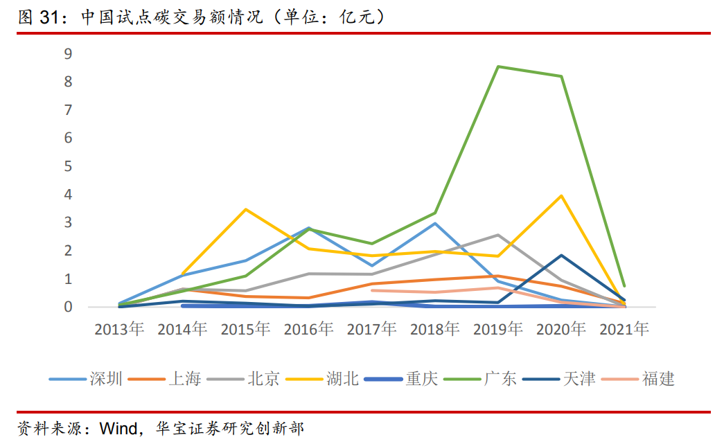 在北美洲,多個區域性質的碳交易體系并存。在亞洲,韓國是首個啟動全國統一碳交易市場的國家,已成為世界第二大國家級碳市場。在大洋洲,作為較早嘗試碳交易市場的澳大利亞目前已基本退出碳交易舞臺,僅剩新西蘭,該國碳排放權交易體系目前穩步發展。就我國而言,目前還處于碳排放交易的試點階段,一旦全國性的碳交易體系啟動,將步入碳排放交易的市場階段。目前,全國共有8個地區在開展碳排放權交易試點,包括:北京、天津、上海、重慶、湖北、廣東、深圳、福建。