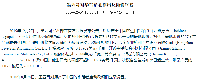 據外媒報道,12月27日墨西哥經濟部宣布,將對原產于中國的鋁箔紙卷以及鋁制高壓鍋產品加收費用,費率最高達92.64%,原因是中國出口到當地的鋁制壓力鍋價格低于上限設定的每公斤3.4817美元。
