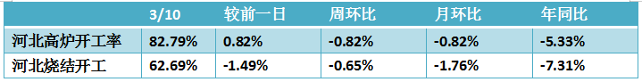 3月10日河北高爐開工率為82.79%,較上一日增加0.82個(gè)百分點(diǎn),且周環(huán)比和月環(huán)比降幅并不明顯。目前鋼廠庫(kù)存逐步向市場(chǎng)轉(zhuǎn)移,且產(chǎn)量出現(xiàn)上升趨勢(shì)。需要警惕產(chǎn)量上升進(jìn)一步推升社庫(kù)壓力。