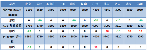 現(xiàn)貨方面,螺紋穩(wěn)中偏弱,廣州下跌70,其余部分市場(chǎng)下跌10-20,均價(jià)下調(diào)5;熱卷穩(wěn)中部分小漲10-40,均價(jià)上調(diào)7;中板持穩(wěn)個(gè)別上漲10-30,均價(jià)上調(diào)1。各地市場(chǎng)價(jià)格變動(dòng)如下: