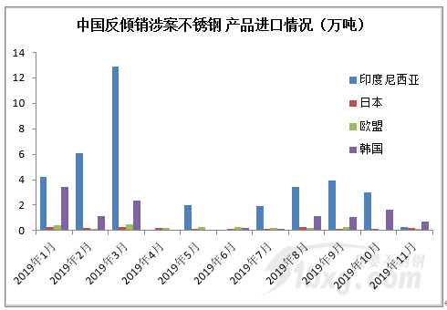 前期因印尼進(jìn)料加工貿(mào)易產(chǎn)品增多,國內(nèi)不銹鋼進(jìn)口量增加,而11月印尼來、進(jìn)料加工量僅0.17萬噸(占印尼進(jìn)口料的34%),加上反傾銷涉案產(chǎn)品進(jìn)口持續(xù)維持低位,導(dǎo)致11月國內(nèi)不銹鋼進(jìn)口降至年內(nèi)低點,與4月(反傾銷初裁發(fā)布)進(jìn)口量相當(dāng)。青山印度不銹鋼冷軋項目于11月下旬因沒有環(huán)境許可證(EC)而暫停,印尼國內(nèi)消化能力有限,所以12月可能會有大量的印尼資源出口至中國。據(jù)業(yè)內(nèi)人士分析,12月印尼冷軋進(jìn)口量預(yù)計可至3萬噸,加上目前方坯也不再征收反傾銷稅后,12月其方坯的進(jìn)口量也將增多。受國外反傾銷影響,今年以來國內(nèi)不銹鋼出口同比下降,但出口意大利的累計量同比增加20%(累計出口量僅25.8萬噸)。因國外圣誕節(jié)備貨刺激消費(fèi),11月國內(nèi)不銹鋼出口多小增,目前處于年內(nèi)高位。(出口韓國的量已連續(xù)3個月增加,創(chuàng)年內(nèi)新高至5.6萬噸)進(jìn)口降至年內(nèi)低點 出口增至年內(nèi)高點11月中國進(jìn)口不銹鋼5.05萬噸,環(huán)比減少42.4%,同比減少60.4%;出口不銹鋼32.89萬噸,環(huán)比增加4.5%,同比增加7.9%。2019年1-11月,中國進(jìn)口不銹鋼累計102.3萬噸,同比減少73.1萬噸,減幅41.7%;出口不銹鋼累計335萬噸,同比減少36.3萬噸,減幅9.8%。反傾銷涉案產(chǎn)品進(jìn)口持續(xù)低位11月,從印度尼西亞進(jìn)口涉案產(chǎn)品約0.28萬噸(其中進(jìn)、來料加工的量約0.17萬噸)(環(huán)比下降90.6%),韓國0.68萬噸(環(huán)比下降58.7%),歐盟0.17萬噸(環(huán)比增加83.7%),日本0.24萬噸(環(huán)比增加101.3%)。印尼資源回國量再降至0.5萬噸,年內(nèi)低點11月從印尼進(jìn)口的不銹鋼寬幅板卷及半制成品的量再次下降,已至0.5萬噸(其中來、進(jìn)料加工的量約0.17萬噸),環(huán)比減少2.9萬噸,減幅85.7%;同比減少5.3萬噸,減幅91.6%。其中:寬幅熱卷有0.24萬噸,環(huán)比減少90.2%,同比減少94%;寬幅冷軋有0.2萬噸,環(huán)比減少47.2%,同比減少75.4%;矩形截面半制成品(俗稱板坯)有0.05萬噸,環(huán)比減少91.9%,同比減少95%;正方形截面半制成品(俗稱方坯)的量為0。