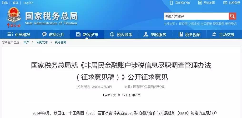 國家稅務(wù)總局在10月14日,在官網(wǎng)上發(fā)布了《非居民金融賬戶涉稅信息盡職調(diào)查管理辦法》(以下簡稱《管理辦法》),向社會公開征求意見。意見截止日期到10月28日。