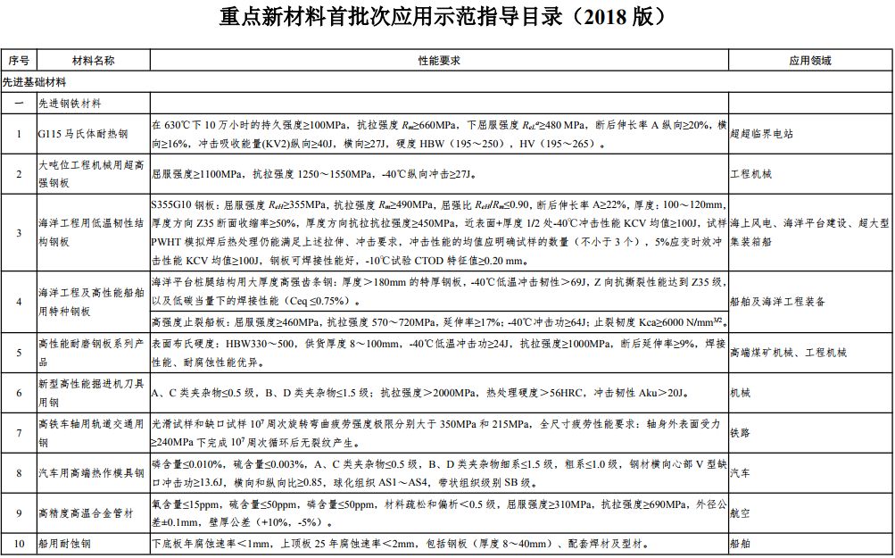 為進一步做好重點新材料首批次應用保險補償試點工作,日前,工業和信息化部發布《重點新材料首批次應用示范指導目錄(2019年版)》(以下簡稱《目錄2019版》),G115 馬氏體耐熱鋼、大噸位工程機械用超高強鋼板、海洋工程用低溫韌性結構鋼板等40種先進鋼鐵材料入選。