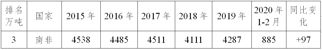 2019年,礦價(jià)大幅上漲刺激其他國(guó)家鐵礦石出口量明顯增加。中國(guó)自澳大利亞、巴西累計(jì)進(jìn)口鐵礦石8.93億噸,同比下降2100萬(wàn)噸;自其他國(guó)家累計(jì)進(jìn)口鐵礦石1.76億噸,同比增加1600萬(wàn)噸,基本上填補(bǔ)了對(duì)澳大利亞和巴西的供應(yīng)缺口。2020年1-2月,中國(guó)自除澳巴外其他國(guó)家累計(jì)進(jìn)口鐵礦石3387萬(wàn)噸,同比增加722萬(wàn)噸,彌補(bǔ)了同期巴西發(fā)運(yùn)減量。除伊朗、阿拉伯聯(lián)合酋長(zhǎng)國(guó)供應(yīng)有百萬(wàn)噸水平的下降外,多數(shù)其他主要國(guó)家鐵礦石供應(yīng)量同比增加,其中印度同比增加340萬(wàn)噸。表4:中國(guó)(除澳、巴外)主要國(guó)家進(jìn)口鐵礦石情況