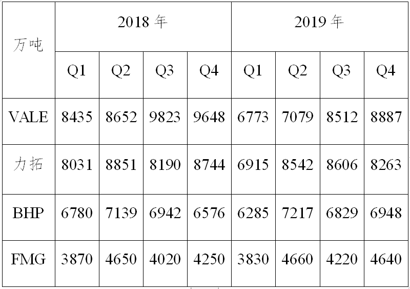 2019年,我國(guó)鐵礦石原礦產(chǎn)量8.44億噸,折合鐵精粉26567萬(wàn)噸。據(jù)國(guó)家統(tǒng)計(jì)局公布的數(shù)據(jù), 2020年1-2月,我國(guó)鐵礦石原礦產(chǎn)量同比下降4.6%,產(chǎn)量下降主要受到疫情的影響。伴隨著國(guó)內(nèi)疫情形勢(shì)向好、各地生產(chǎn)活動(dòng)復(fù)蘇。據(jù)中國(guó)冶金礦山企業(yè)協(xié)會(huì)預(yù)測(cè),二季度,國(guó)產(chǎn)鐵精粉產(chǎn)量將環(huán)比回升,預(yù)計(jì)2020年產(chǎn)量與2019年基本持平。2019年,中國(guó)自澳大利亞進(jìn)口鐵礦石6.65億噸,同比減少1500萬(wàn)噸,占全年進(jìn)口總量的62.21%。由于颶風(fēng)天氣,2019年,澳大利亞四大礦山的產(chǎn)量受到不同程度的影響。季報(bào)顯示,2019年,力拓皮爾巴拉地區(qū)鐵礦石產(chǎn)量3.267億噸,同比減少1110萬(wàn)噸。2019財(cái)年,必和必拓西澳鐵礦產(chǎn)量2.70億噸,同比減少510萬(wàn)噸;FMG鐵礦石產(chǎn)量1.769億噸,同比增加1120萬(wàn)噸;羅伊山鐵礦石產(chǎn)量5500萬(wàn)噸,同比增加180萬(wàn)噸。表1:中國(guó)進(jìn)口澳大利亞鐵礦石情況(海關(guān))