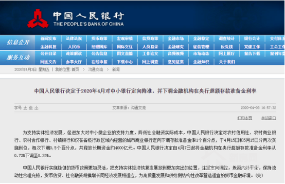 4月3日央行宣布對中小銀行定向降準1個百分點,分別于4月15日和5月15日實施,每次下調0.5個百分點,共釋放長期資金約4000億元。此次降準兩類機構:農村信用社、農村商業銀行、農村合作銀行、村鎮銀行等農村金融機構,和省級行政區主要服務于中小微企業的城市商業銀行。