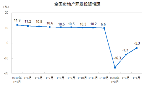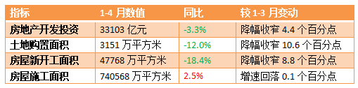 根據國家統計局數據,1-4月全國固定資產投資和房地產投資雖延續下降,但降幅較1-3月均有收窄。其中,1-4月,全國房地產開發投資33103億元,同比下降3.3%,降幅比1-3月收窄4.4個百分點。