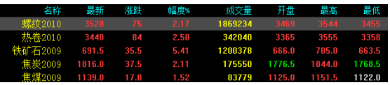 期螺漲75收報3528,期卷漲84收報3440,鐵礦石漲35.5收報691.5,焦炭漲37.5收報1816,焦煤漲17收報1139。