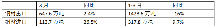 從進出口來看,1-3月出口下滑明顯,同比下降16%,3月鋼材進口增幅遠大于出口變動。海外疫情將持續(xù)影響國內鋼材出口量,同時,在國際鋼價下行壓力下,低價進口空間增加。國內供應壓力會繼續(xù)加大。