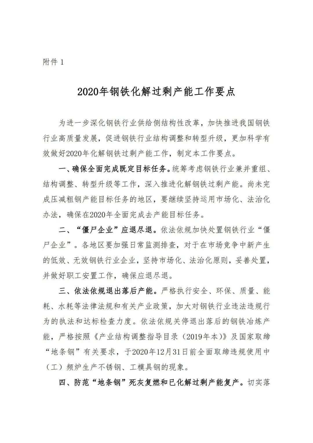關于做好2020年重點領域化解過剩產能工作的通知 發改運行〔2020〕901號 各省、自治區、直轄市、新疆生產建設兵團發展改革委(能源局)、工信廳(工信委、經信委)、財政廳(局)、人力資源社會保障廳(局)、國資委、煤炭行業管理部門,有關中央企業: 2016年以來,各地區、各有關部門按照黨中央、國務院關于供給側結構性改革的決策部署,扎實推進重點領域化解過剩產能工作,統籌做好職工安置、“僵尸企業”處置、結構調整、兼并重組、轉型升級等工作,總量性去產能任務全面完成,系統性去產能、結構性優產能初顯成效。產業結構和生產布局得到優化,供給質量和效率大幅提升,安全環保形勢持續好轉,市場競爭秩序有效規范,行業健康發展的長效機制不斷完善。2020年是全面建成小康社會和“十三五”規劃的收官之年,為扎實做好“六穩”工作,落實“六保”任務,統籌推進疫情防控和經濟社會發展工作,深入推進供給側結構性改革,全面鞏固去產能成果,現就有關工作通知如下; 一、準確把握2020年去產能總體要求。以習近平新時代中國特色社會主義思想為指導,全面貫徹黨的十九大和十九屆二中、三中、四中全會精神,按照中央經濟工作會議要求,緊扣全面建成小康社會目標任務,堅持穩中求進工作總基調,堅持新發展理念,堅持以供給側結構性改革為主線,堅持以改革開放為動力,推動高質量發展。堅持鞏固、增強、提升、暢通的方針,著力鞏固去產能成果,持續推動系統性去產能、結構性優產能,不斷提升職工安置和資產債務處置質量,全面提高行業治理能力。 二、全面鞏固去產能成果。尚未完成“十三五”去產能目標的地區和中央企業,要統籌推進各項工作,確保去產能任務在2020年底前全面完成。全面實施去產能項目“回頭看”,認真落實產能認定、關閉標準、獎補資金使用、產能置換等方面的相關規定,確保各類督查和自查發現的問題及時整改到位。國家有關部門將繼續開展鞏固鋼鐵煤炭去產能成果專項督查抽查,堅決防止已經退出的項目死灰復燃。進一步完善去產能和產能置換工作臺賬,為“十四五”發展打好基礎。切實抓好去產能政策的宣貫落實,強化監督問責,確保相關要求落實落細落地。 三、繼續深化鋼鐵行業供給側結構性改革。進一步完善鋼鐵產能置換辦法,加強鋼鐵產能項目備案指導,促進鋼鐵項目落地的科學性和合理性。進一步加強事中事后監管,嚴格落實安全、環保、能耗、質量、用地、產業政策和產能置換等相關要求,嚴禁以任何名義、任何方式新增鋼鐵冶煉產能,嚴肅查處各類鋼鐵產能違法違規行為,加快推動落后產能退出,嚴防“地條鋼”死灰復燃和已化解過剩產能復產。指導企業復工復產,做好行業運行監測分析,維護行業平穩運行。進一步推動鋼鐵行業綠色化發展,加快京津冀及周邊地區、長三角地區、汾渭平原等大氣污染防治重點區域鋼鐵企業超低排放改造,發展電爐鋼工藝。進一步推動鋼鐵企業實施兼并重組,增強企業創新意識,為鋼鐵行業實現由大到強轉變奠定堅實基礎。 四、持續推進煤炭上大壓小、增優汰劣。嚴格安全、環保、質量等方面執法,堅決淘汰不具備安全環保條件、不符合產業政策的落后產能。堅持產能置換長效機制,引導低效無效產能有序退出。深入推進煤炭行業“放管服”改革,加快推動在建煤礦投產達產,合理有序釋放先進產能,實現煤炭新舊產能有序接替。統籌推進煤電聯營、兼并重組、轉型升級等工作,促進煤炭及下游產業健康和諧發展。著力加強煤炭產供儲銷體系建設,持續提升供給體系質量,增強能源保障和應急調控能力。充分發揮市場配置資源的決定性作用,不斷完善現代煤炭交易市場體系,進一步降低交易成本、提高市場效率。 五、積極穩妥推進煤電優化升級。充分發揮市場調節和宏觀調控作用,淘汰關停不達標落后煤電機組。繼續做好現有違規建設煤電項目的清理整頓工作,堅決杜絕新發生違規建設煤電項目的情況。發布實施年度風險預警,按需有序核準建設煤電項目,按需適度新增煤電產能,做好煤電應急備用和應急調峰儲備電源工作。持續推進燃煤電廠超低排放和節能改造工作。進一步增強電力、熱力供應保障能力,鞏固化解煤電過剩產能工作成果,提升煤電清潔高效發展水平。 六、加快“僵尸企業”處置。認真貫徹落實黨中央、國務院關于“僵尸企業”處置的決策部署,依法依規加快處置2019年底摸底確定并上報國務院辦公廳的“僵尸企業”。各地區和中央企業要按照要求建立健全工作機制,履行主體責任,加強督促檢查,原則上在2020年底前完成已摸底確定并上報的鋼鐵、煤炭行業“僵尸企業”處置工作。 七、嚴格控制產能總量。更多運用市場化、法治化手段,在控制產能總量的前提下,調整優化存量。嚴格落實《關于完善鋼鐵產能置換和項目備案工作的通知》要求,暫停鋼鐵產能置換和項目備案,并開展自查自糾工作,確保鋼鐵項目要符合安全、環保、能耗、質量、用地、產業政策和產能置換等相關要求。嚴格禁止在國家公園、自然保護區、風景名勝區、飲用水水源保護區規劃布局新的煤礦項目,嚴格限制高硫高灰高砷煤項目開發。 八、統籌做好去產能保供應穩預期工作。有關地區和中央企業要充分認識供需形勢的新變化新特點,堅持實事求是、因地制宜,綜合考慮地