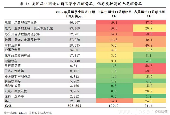 從上述貿易結構來看,通信設備、自動數據處理設備和機械產品等后續也有可能被美國盯上。若與中國發生貿易摩擦,特朗普政府的目標比較明確,在減少對華貿易逆差的同時,其措施需要有助于振興美國制造業,從而替代從中國進口的商品并提高美國制造業的就業。這就使得上述行業可能易受美國的制裁,因為這些行業美國尚有制造能力。中國的反制措施應該是機電產品、飛機、汽車和農產品等。
