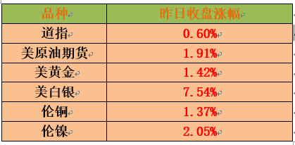 昨日晚間,全球金融市場和大宗商品再度躁動,歐美股市普遍上漲,大宗商品全線爆發,美原油期貨上漲1.91%;美黃金和白銀再創本輪上漲新高,美白銀期貨收盤大漲7.54%,較年內低點累計上漲超100%;有色倫銅上漲1.37%、倫鎳上漲2.05%。
