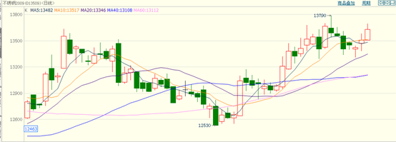 在整個上漲氛圍帶動下,不銹鋼期貨晚間亦是維持上漲走勢,晚間收盤上漲140元至13640元/噸,直逼前期高點13800附近。