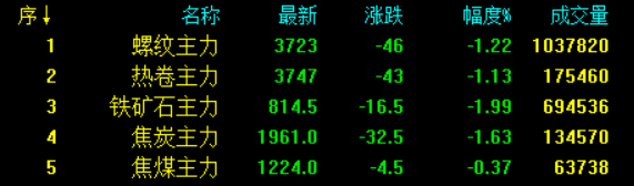 螺紋期貨再度走弱,午收3723跌46;熱卷弱勢震蕩,午收3747跌43;原料端焦炭震蕩走弱,午收1961跌32.5;礦石弱勢震蕩,午收814.5跌16.5,跌幅1.99%。