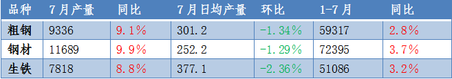 國家統計局數據顯示,7月我國生鐵、粗鋼、鋼材產量同比仍高于去年同期水平,但從日均產量環比數據來看,均出現回落,說明7月淡季影響下,增產動力減弱,產量小幅回落,對鋼價形成支撐。