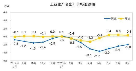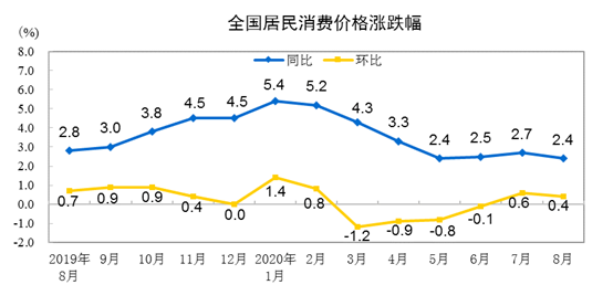 國(guó)家統(tǒng)計(jì)局?jǐn)?shù)據(jù)顯示,8月CPI同比增長(zhǎng)2.4%,漲幅較上月回落0.3個(gè)百分點(diǎn)。PPI同比下降2.0%,降幅較上月收窄0.4個(gè)百分點(diǎn)。