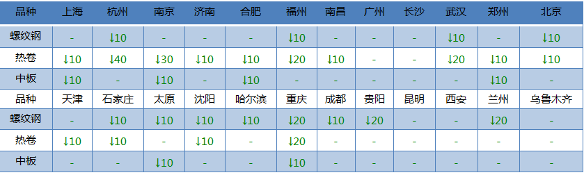 螺紋鋼24個(gè)市場(chǎng)中12個(gè)市場(chǎng)下跌10-20,20mmHRB400E平均價(jià)格3808元/噸,較上個(gè)交易日下調(diào)6元/噸;