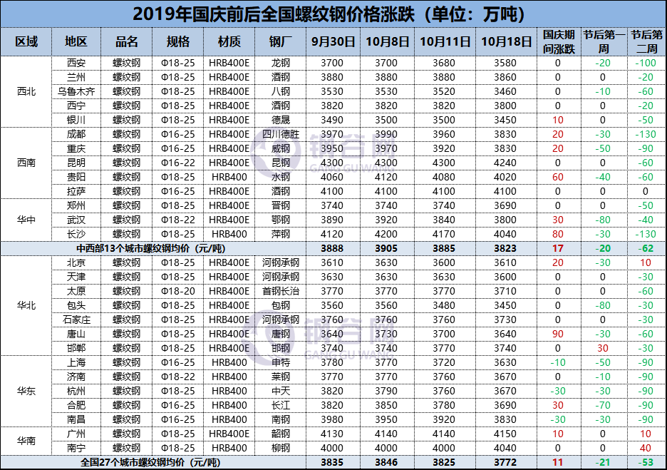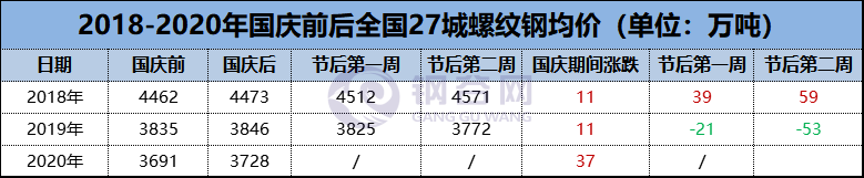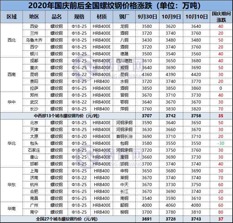 從我網(wǎng)數(shù)據(jù)來看,2018-2019年國慶前后全國螺紋鋼價格漲跌震蕩, 2018年國慶節(jié)后第一、二周價格上漲為主,2019年國慶節(jié)后第一、二周價格連續(xù)下跌,而今年國慶節(jié)后全國螺紋鋼價格迎來開門紅,均價較節(jié)前上漲37元/噸,城市漲幅20-80元/噸,其中烏魯木齊、重慶、長沙、天津、濟南、杭州、南昌、廣州、南寧價格漲幅均在50元/噸以上。金九落空,銀十期待。節(jié)后鋼價延續(xù)上漲,鋼坯連漲90至3390元/噸,下游采購較為積極,部分商家鎖貨,節(jié)后鋼價盼漲情緒較濃,但鑒于雙節(jié)期間市場到貨量增加,庫存回升,商家降庫為主。后市能否實現(xiàn)“銀十”預期,仍需謹慎,持續(xù)關注需求釋放力度。