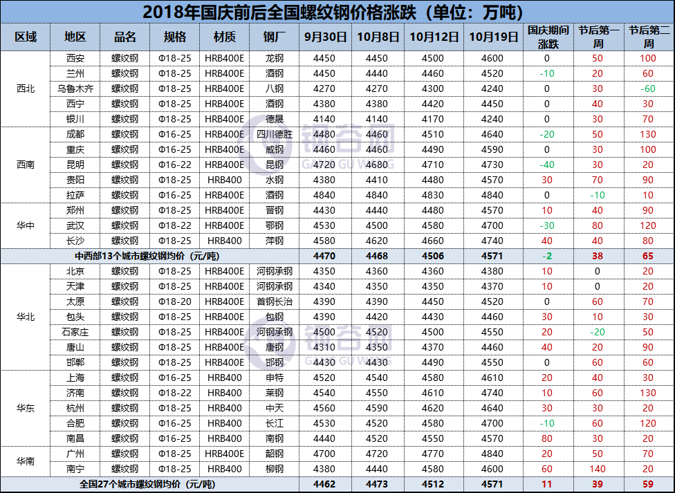 十一節(jié)后鋼價迎來開門紅,各地價格普遍拉漲,受宏觀消息以及秋冬季限產(chǎn)范圍擴大加碼影響,期貨也是高開高走,市場信心明顯提振,成交表現(xiàn)尚可,西北、西南、華東、華中區(qū)域市場成交較好,終端采購多隨采隨用,貿(mào)易商挺價出貨為主,鋼谷網(wǎng)發(fā)布庫存數(shù)據(jù),中西部11個城市建材社會庫存總量425.02萬噸,較上周增加19.98萬噸,增幅4.93%;全國31個城市建材社會庫存總量1095.15萬噸,較上周增加35.42萬噸,增幅3.34%,庫存增加主要因國慶期間,市場休市,成交零星,因此社庫和廠庫均出現(xiàn)增加,從行情來看,節(jié)后鋼材價格穩(wěn)中偏強運行將會成為主流發(fā)展方向。