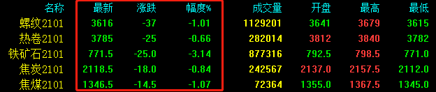 期鋼沖高回落,最終收跌。期螺下跌17收報3616,期卷下跌25收報3785,鐵礦石下跌25收報771.5,焦炭下跌18收報2118.5,焦煤下跌14.5收報1346.5。