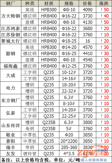 據數據監測,今日共23家鋼廠調價,其中漲幅最高為韶鋼建材,調價幅度20元/噸,具體調價明細如下: