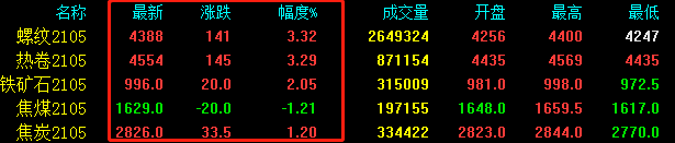 期螺上漲141收報4388,期卷上漲145收報4554,鐵礦石上漲20收報996,焦煤下跌20收報1629,焦炭上漲33.5收報2826。